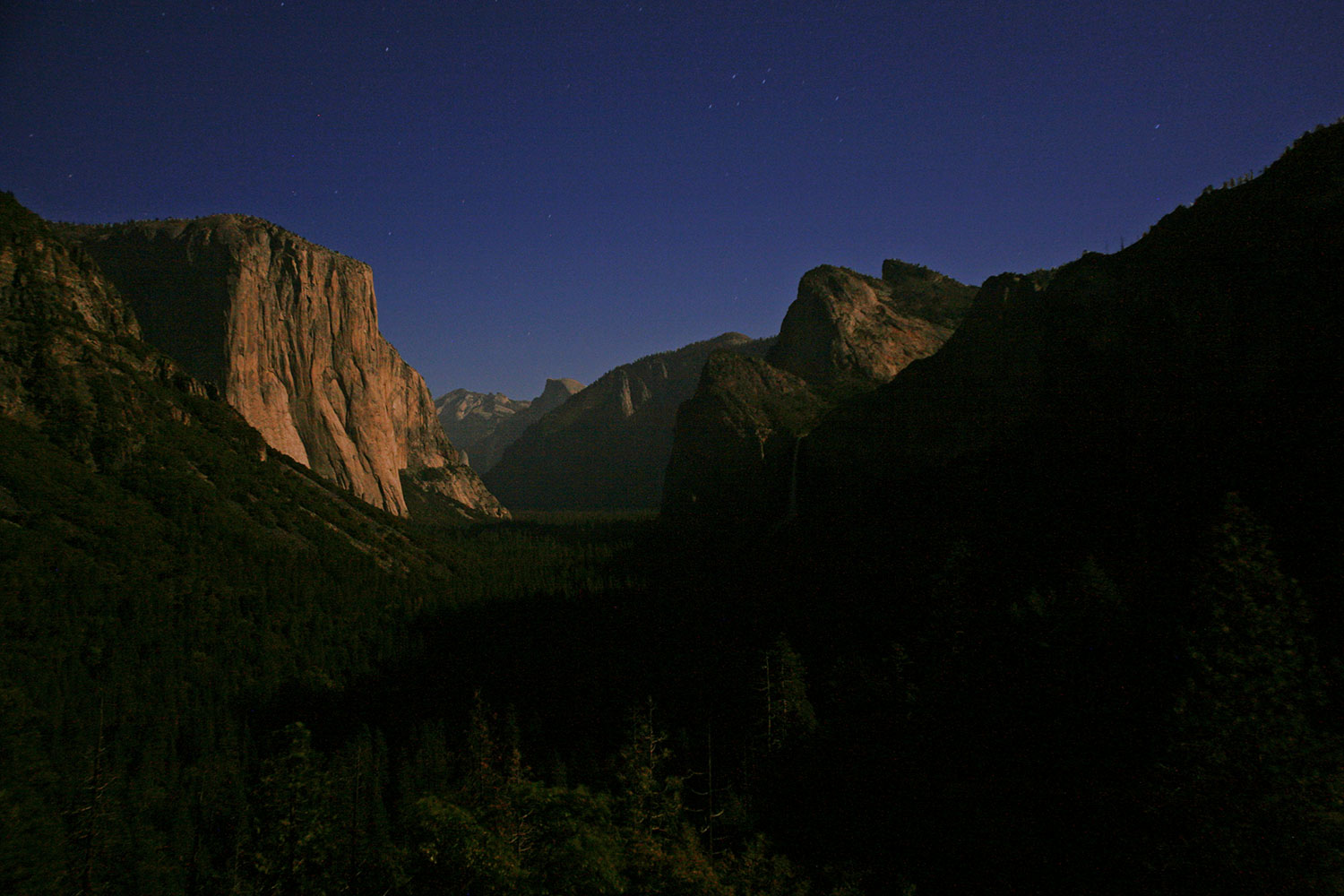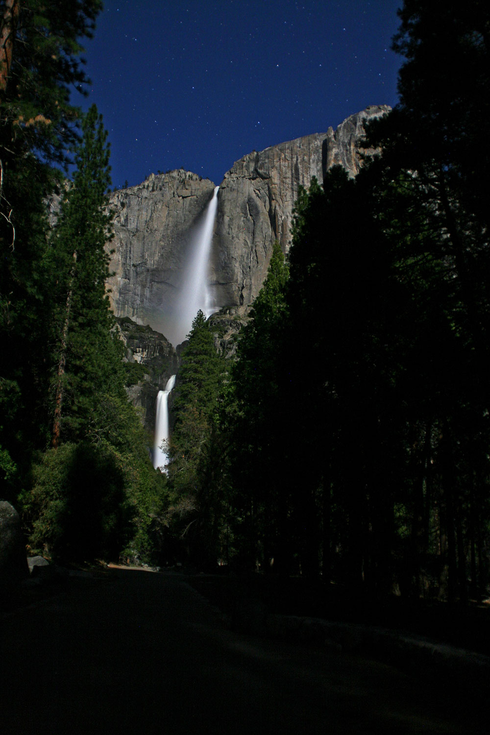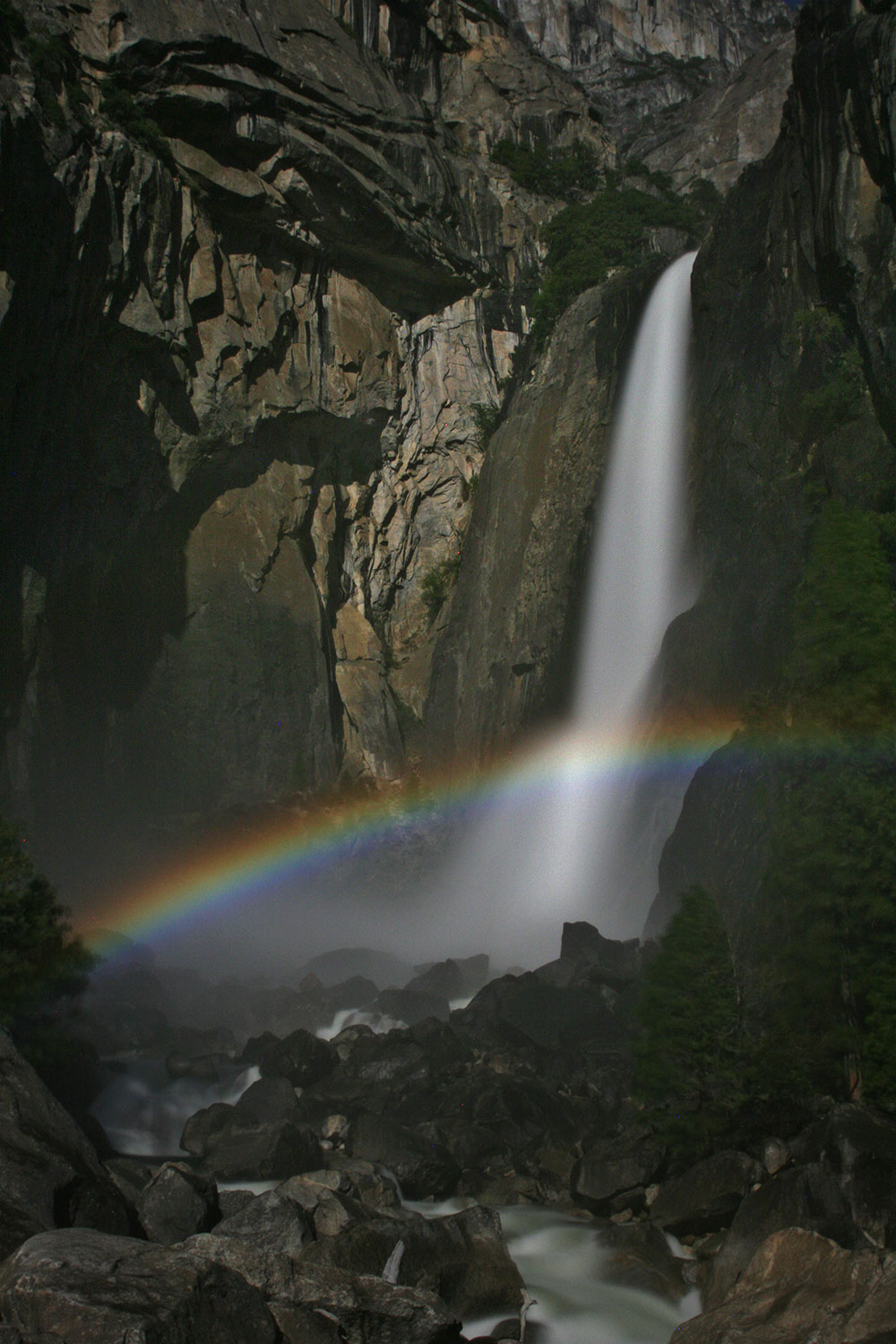 Arriving just before 1 am, I was amazed and delighted to see this wonderful moonbow. The trail to the Lower Yosemite Falls held high expectations as the path was well lit and the waterfalls were glowing and bright catching the full moon framed by deep shadows of pines, oaks, and large boulders sitting like silent immovable Tolkienesque-like trolls.
