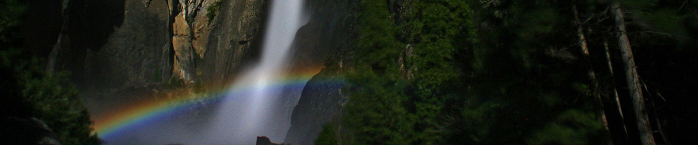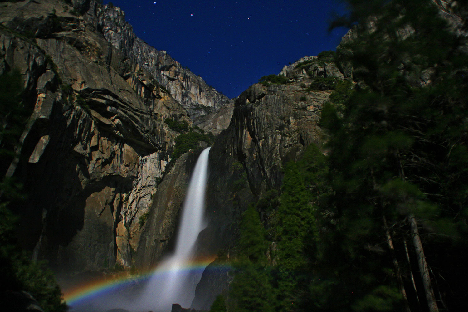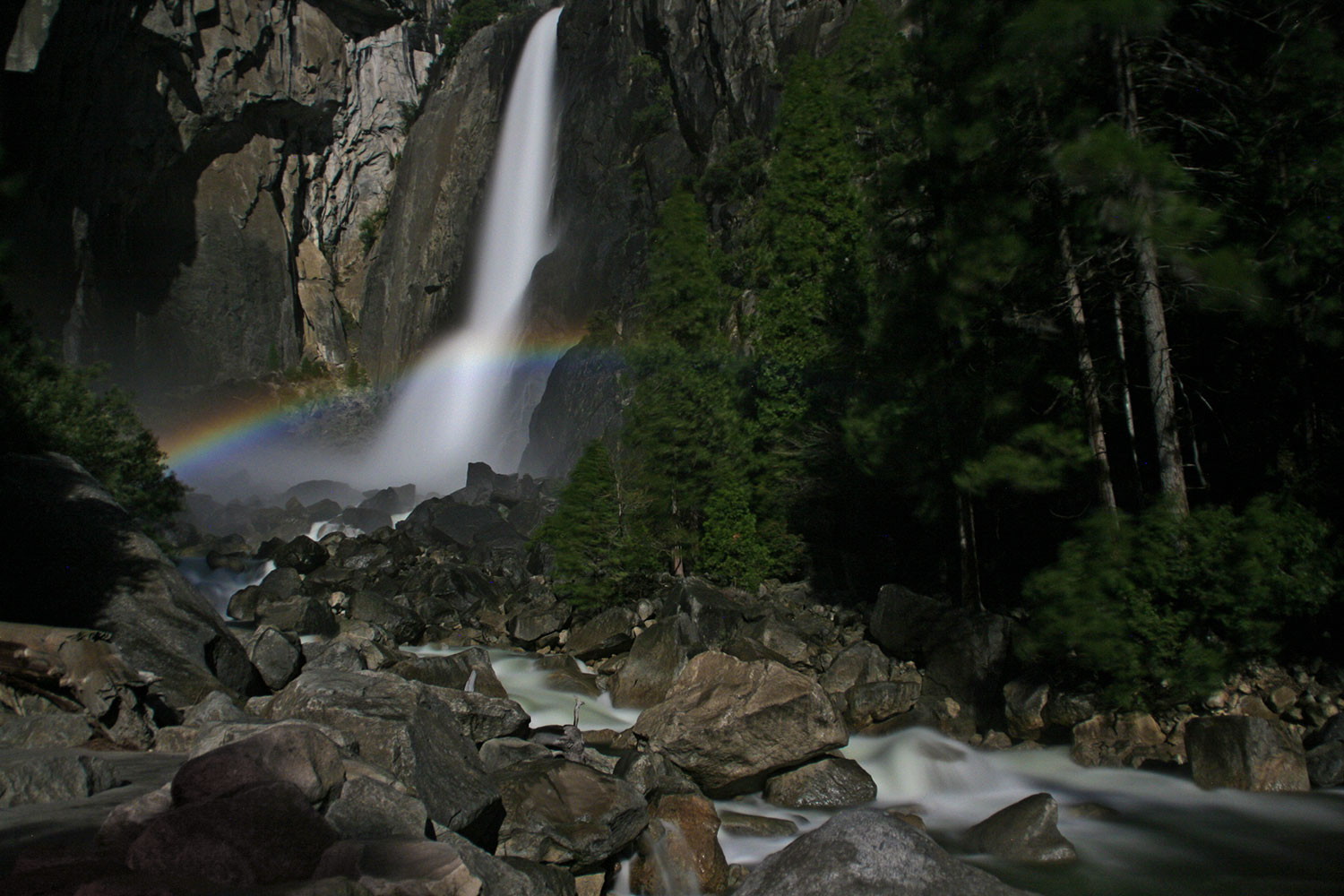 By far the most impressive and majestic are the moonbows of the Yosemite Falls. Like the Firefall at Yosemite near El Capitan, a number of conditions must be met to see a moonbow, including a full moon, a cloudless sky and wind to kick up a decent spray from the waterfall.